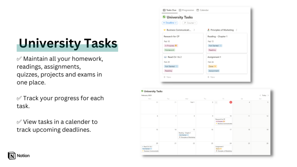 ⚡ University Tasks: Your ultimate task tracker, including both personal and assigned tasks such as assignments, quizzes, projects and exams. You can even view your tasks according to courses, dates or deadlines.